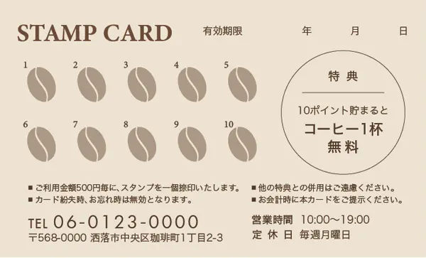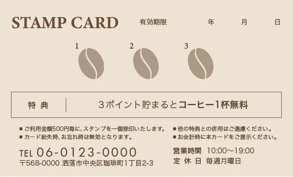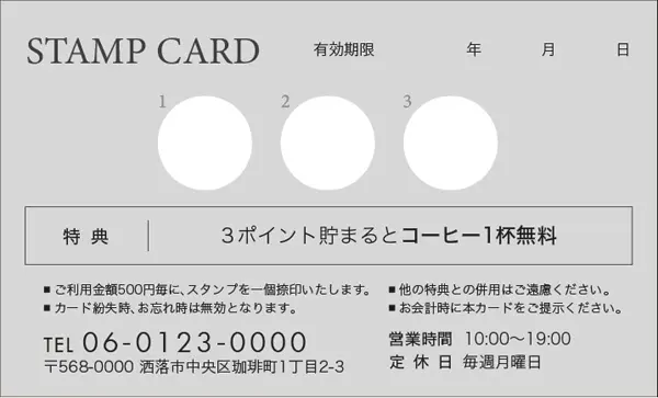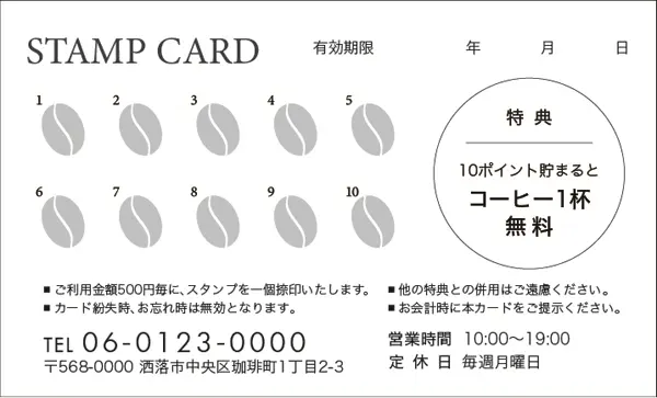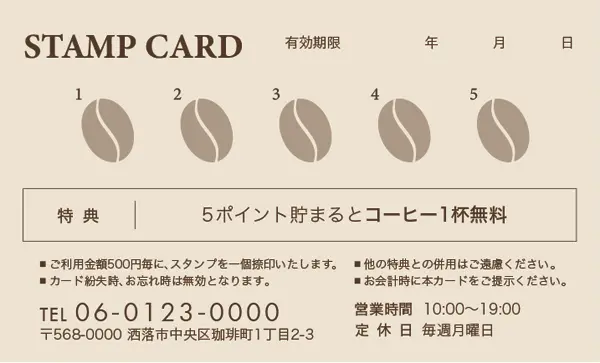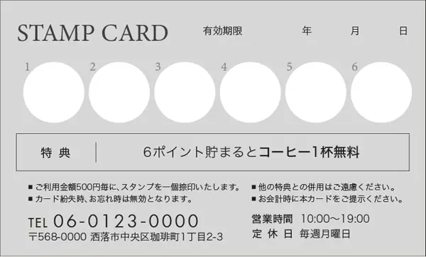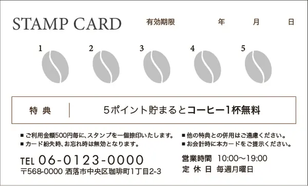 \ ポイント面デザイン / スタンプカード【カフェ喫茶店用】 Size:91x55mm or 85x54mm 割引の金額等など内容を変更カスタマイズします!!マス目の数や項目などお気軽にご相談ください。 品番:CCU-001 品番:CCU-002 品番:CCU-003 品番:CCU-004 品番:CCU-005 品番:CCU-006 品番:CCU-007 品番:CCU-008 品番:CCU-009 品番:CCU-010 品番:CCU-011 品番:CCU-012 品番:CCU-000 « 戻る 注意:ご使用のモニターにより実際の印刷物の色味と若干ことなる場合がございます。